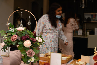 Jaimy's Matron of Honor decided to get a custom "Welcome to Jaimy's Bridal Shower" frame done, which turned out to be absolutely beautiful. Of course, we placed the frame at the foyer, by the corner, on a round decorated table. Masks and individual mini-size hand sanitizers were also laid for the guests to help themselves to, given that we were all still COVID cautious. I, on the other hand, decided to decorate a Wreath Floral stand which became the decorative centerpiece by the foyer and the welcome sign. A little creative imagination with silk florals, eucalyptus garlands and cake toppers conveyed the subtle message about the bride!!