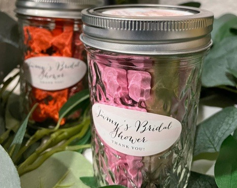 And me, being the detail-oriented person I am of course, didn't stop there. I ordered custom Bridal shower favor labels for the jars, some additional treats that accompanied the pedicure jar kits like personalized Hersey's Candy, mini tea light candles (I had these as leftovers from another event!), and Gummy bear treats (since the bride-to-be loved gummy bears!!). As I was noodling on thoughts of adding potential final touches to the favor package, I decided to get Organza bags for the candy, Gift Bags for the final assembled product and Thank you labels to spruce it all up. I added a fancy brooch, as a decorator/hostess's signature touch, for the favor.